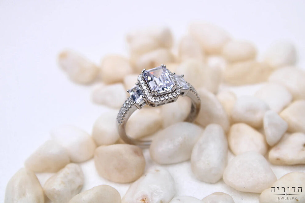 טבעת שמדברת גיאומטריה טהורה. אבן מרכזית בחיתוך אמרלד, שתי אבנים נוספות מהצדדים, וקו דק של זרקונים שעוטף הכל. זה פשוט עובד.