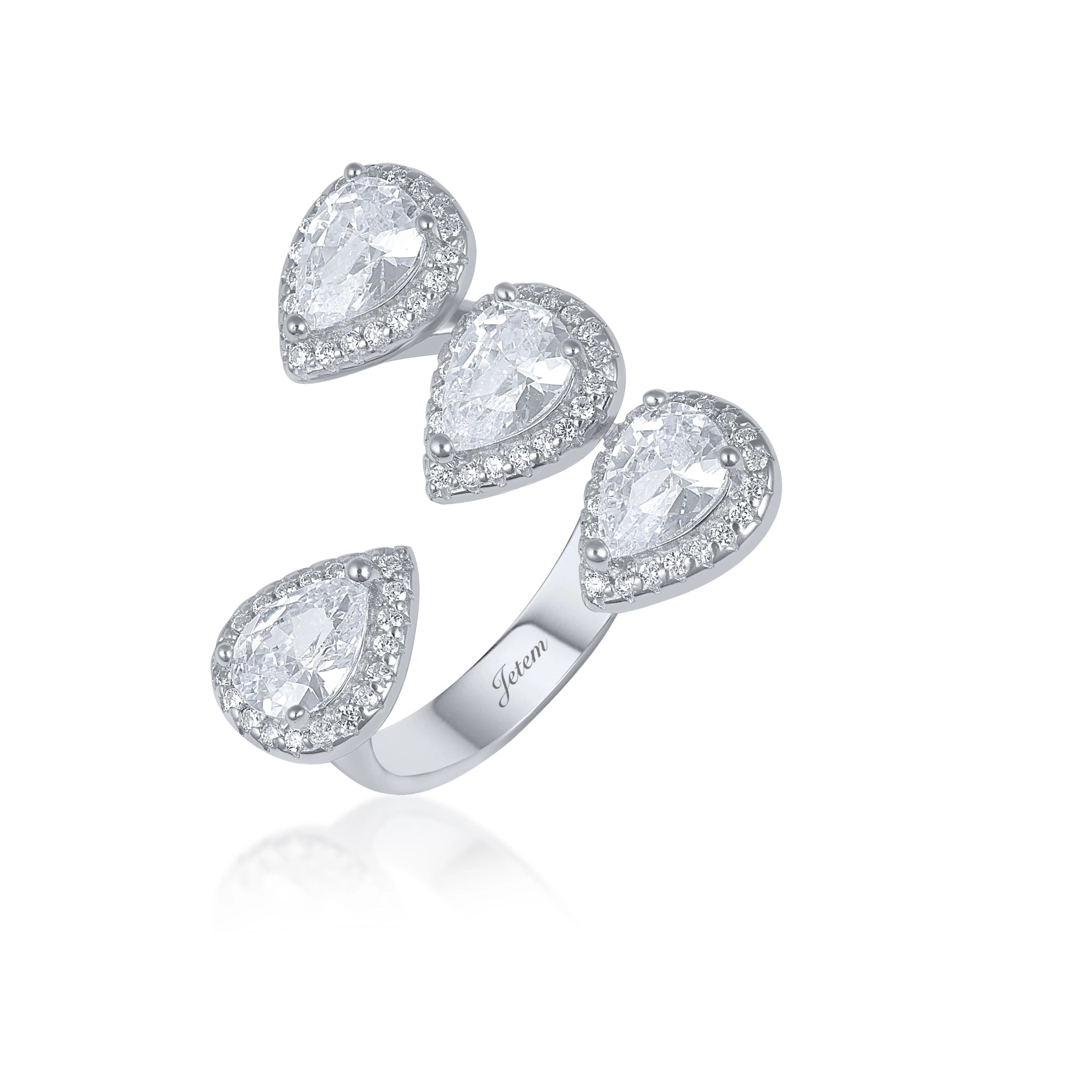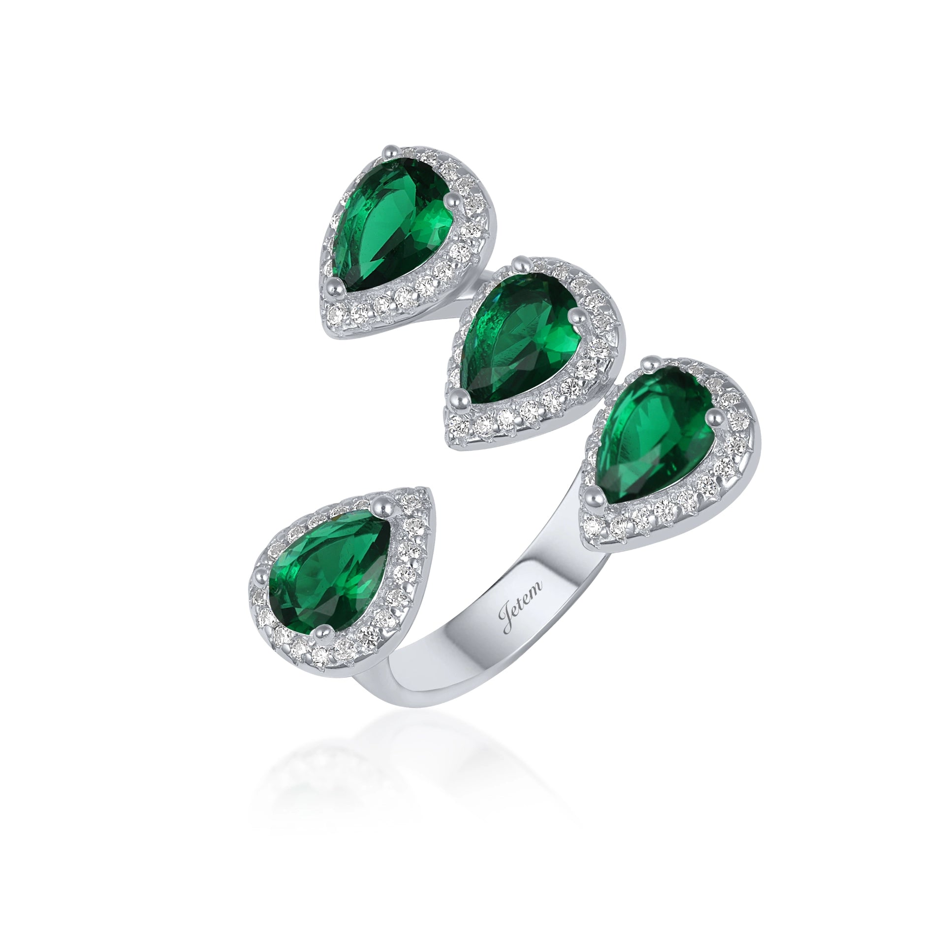 העניקי לעצמך מראה מלכותי עם טבעת הכסף היוקרתית מבית . הטבעת מעוצבת בעדינות עם ארבעה אבני חן ירוקות בצורת טיפה,