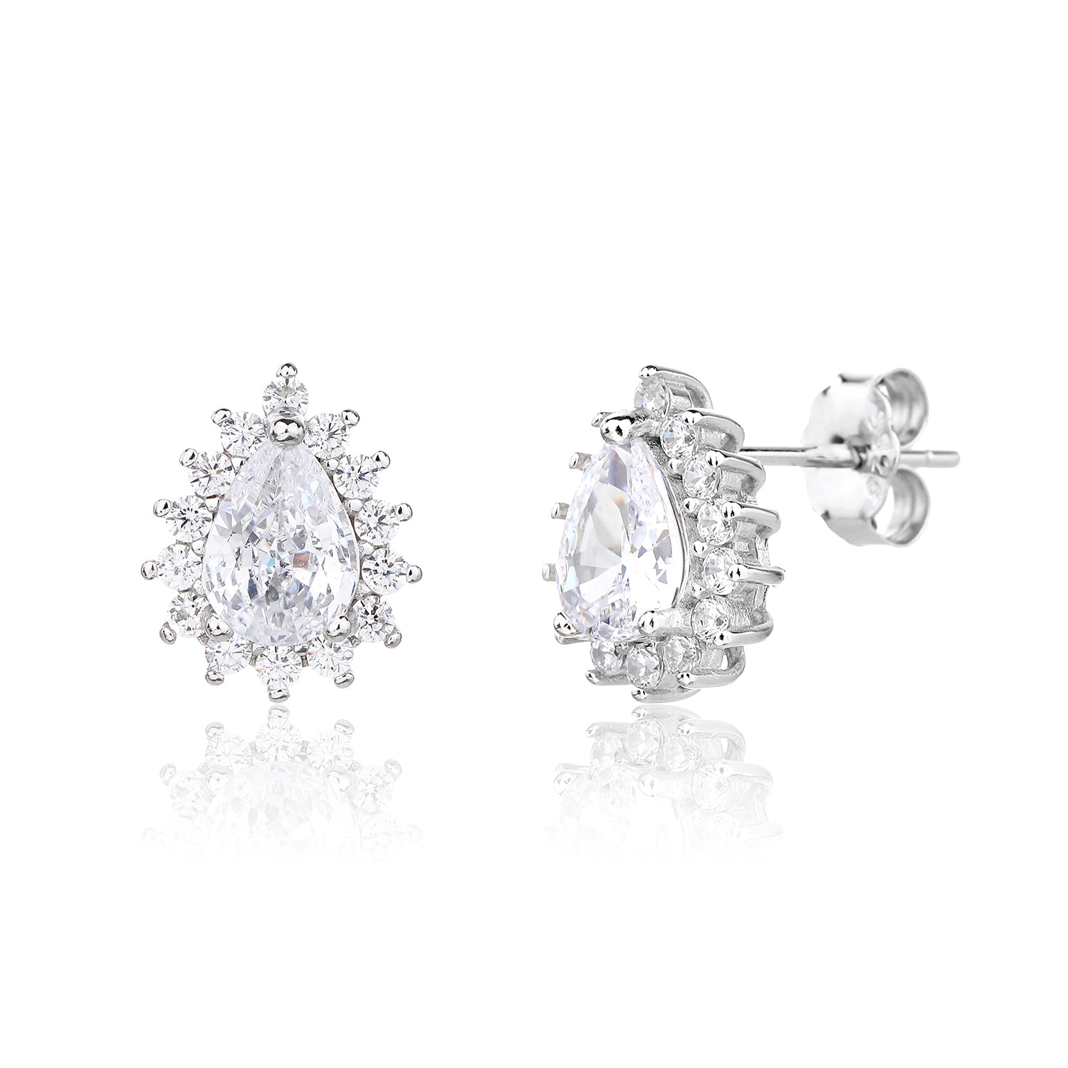 עגילי טיפה משובצים עשויים כסף 925 טהור, עם אבן מרכזית בחיתוך טיפה מוקפת בזירקונים קטנים לניצוץ מלא ועשיר.