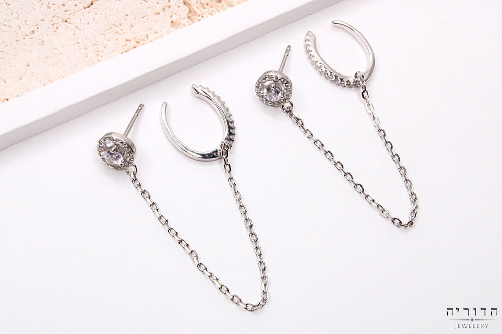 סטאד קטן עם אבן במרכז. חישוק שנכנס מאחוריו. שרשרת עדינה שנופלת מאחורי האוזן.