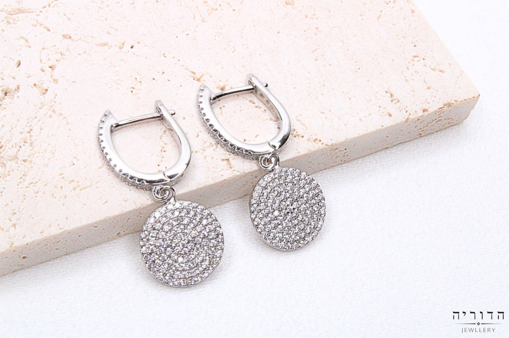 חישוק דק עם עיגול מלא שנוצץ בשקט. הזרקונים הקטנים יושבים צמוד, נותנים ברק רך שנוכח בלי להיות דרמטי. העיגול זז חופשי, מרגיש קליל.