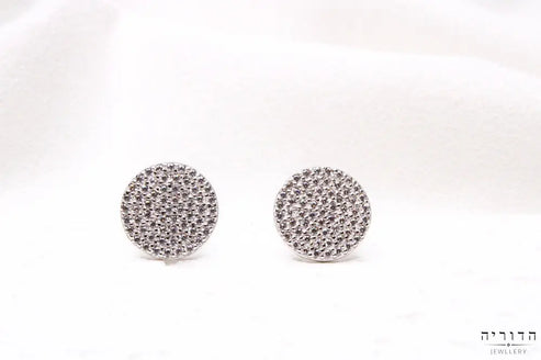 הזרקונים קטנים ומסודרים בצפיפות, מה שנותן מראה אחיד ומלא. הפלטה עגולה לגמרי, והעגיל יושב שטוח על תנוך האוזן.