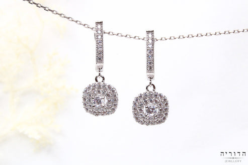 עגיל שלא צועק אבל גם לא נעלם. יש פה משהו בצורה המרובעת הרכה שמרגיש מדויק בדיוק הנכון. אבן מרכזית עם שתי שורות זרקונים סביבה, והכל מרגיש שקט ונכון.