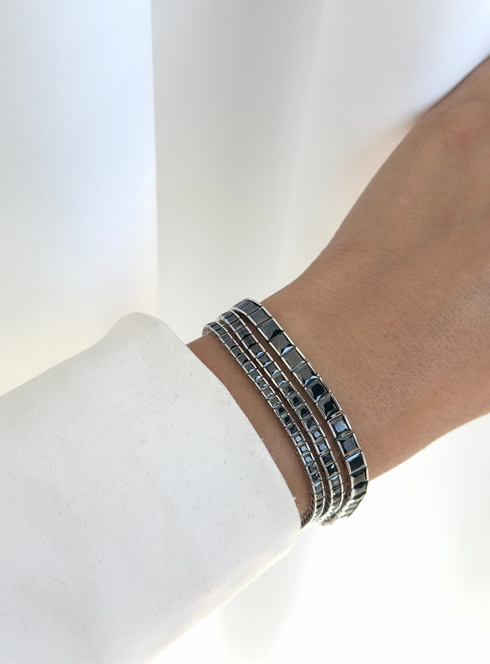 צמיד טניס משובץ אבנים מרובעות בצבע שחור, עשוי כסף 925 טהור. שילוב מרשים של עיצוב קלאסי עם טאץ' מודרני - מושלם להשלמת כל הופעה עם סטייל מדויק ונוכחות יוקרתית, הצמיד כולל סוגר בטיחות כפול לסגירה נוחה ובטוחה לאורך כל היום.