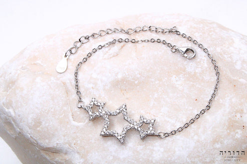 שלושה כוכבים בשורה, כל אחד במרווח שלו, אבל יחד הם זורמים כמו קו אחד. הצמיד קליל, השרשרת נעה בנוחות, והכוכבים תופסים את האור בדיוק כמו צריך.