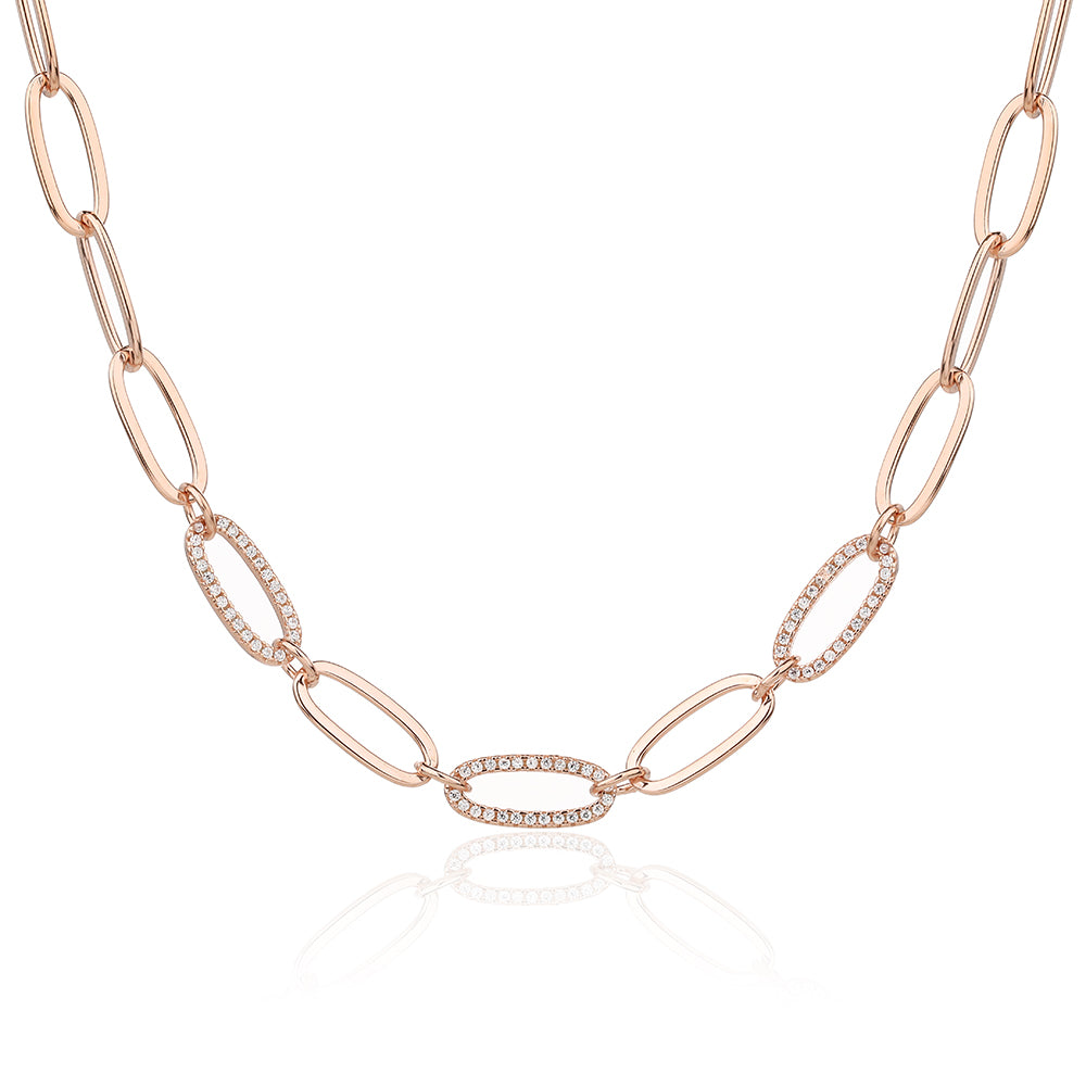 שרשרת חוליות אובליות בעיצוב מודרני ויוקרתי, עשויה כסף 925 טהור בציפוי זהב אדום (רוז גולד). החוליות משולבות בעיטורי זרקונים נוצצים להוספת ברק ונוכחות אלגנטית. מתאימה כפריט מרכזי בלוק ערב או לשדרוג הופעה יומיומית עם סטייל ייחודי.