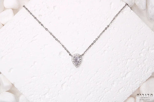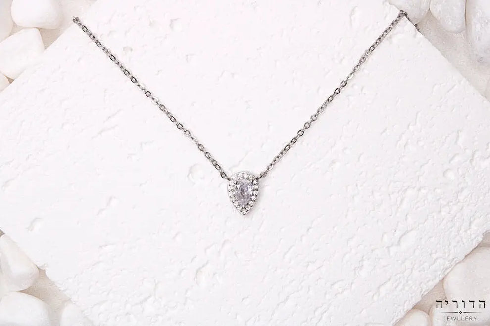 תליון טיפה שקופץ בדיוק למקום הנכון על הצוואר. זרקון מרכזי בחיתוך טיפה, מוקף במסגרת זרקונים דקיקים שלוכדים אור. זה לא דרמטי אבל גם לא נעלם — באותה נקודה בינונית שעובדת.