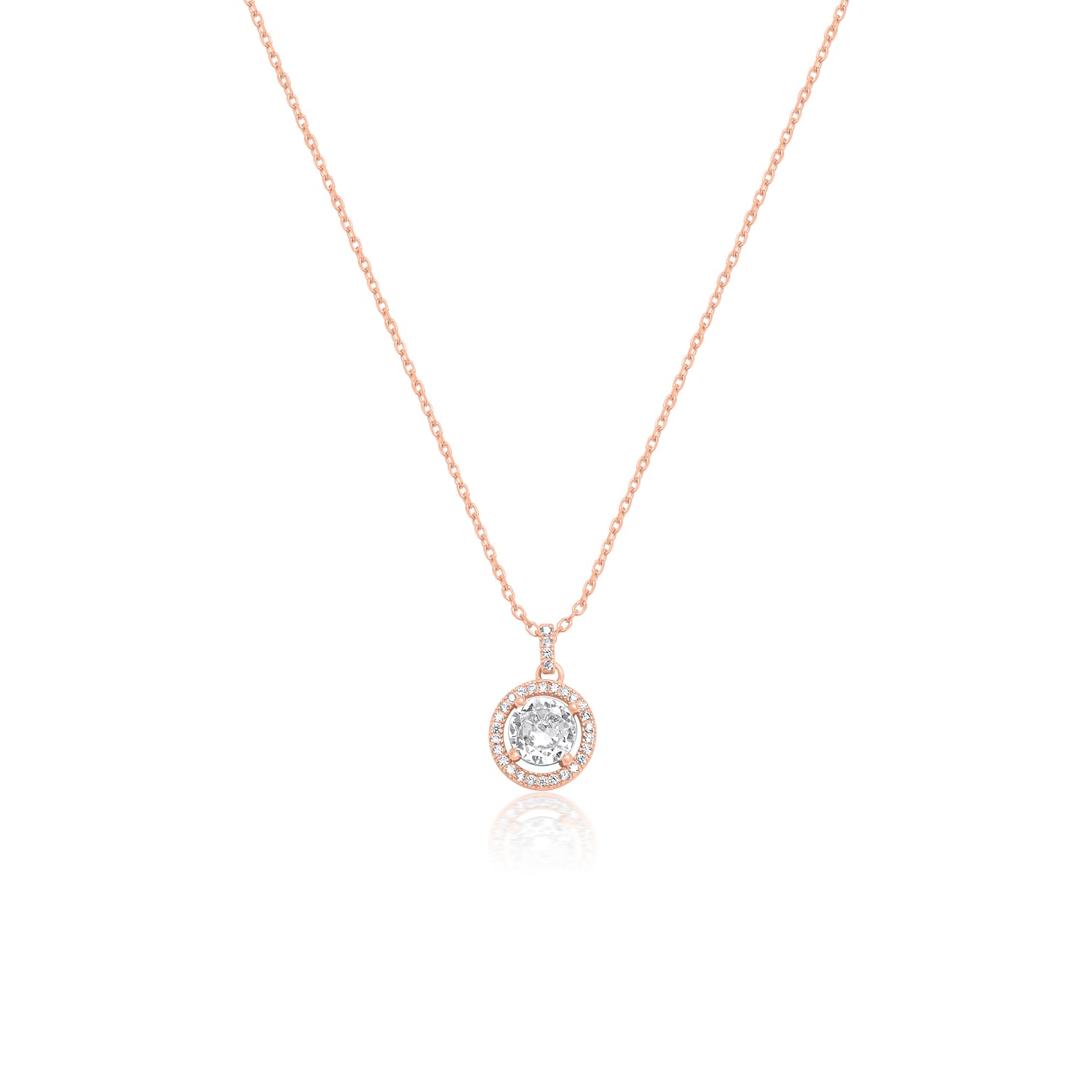 שרשרת תליון סוליטר משובצת, זרקון מרכזי ומסביב זרקונים קטנים נוצצים, עשויה כסף 925 טהור בציפוי זהב אדום (רוז גולד).