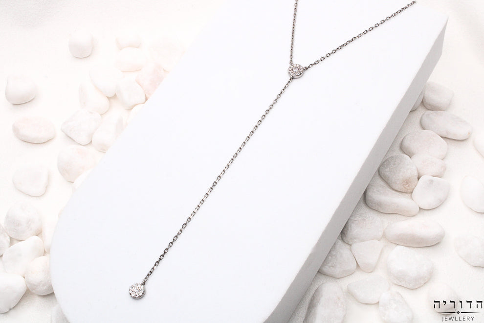 שרשרת Y עם שני עיגולים משובצים – אחד יושב בצוואר, והשני יורד למטה בקו עדין. הזרקונים הקטנים מבריקים בשקט, והקו האנכי נותן תחושה אוורירית ומאוזנת.