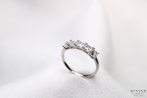 חמש אבנים מרובעות עומדות בדיוק במרחק שווה. כל זרקון יושב במקום שלו, שקוף וחד, והטבעת מתיישבת על הסדר הזה. זה גיאומטרי ונקי.