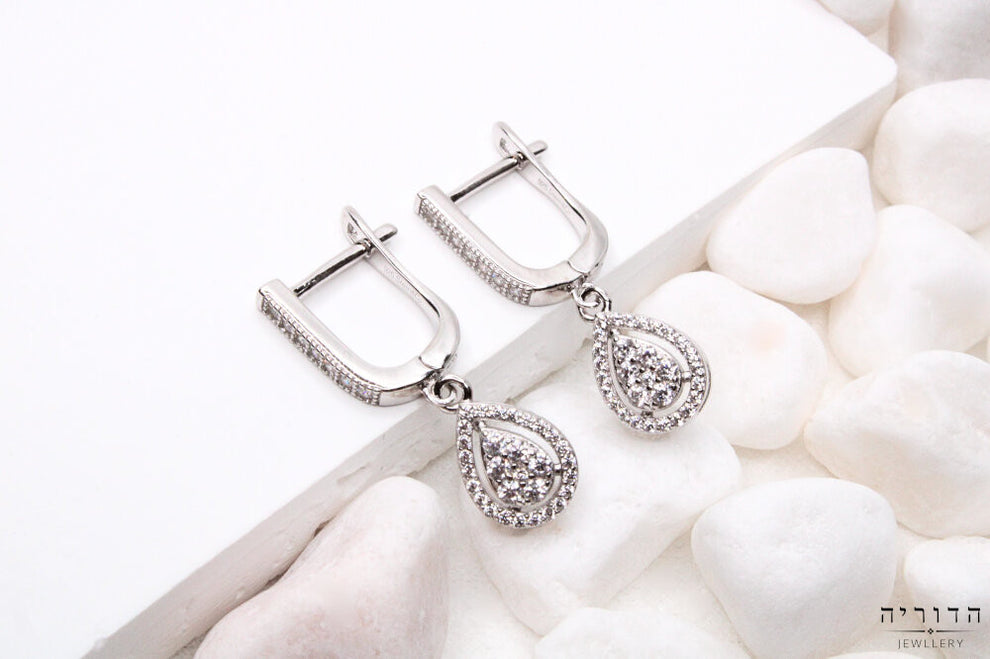 עגילים שנופלים בקלילות. טיפה משובצת בזרקונים שקוראים את האור בשקט. הם קלים, נוחים, ועובדים גם בבוקר וגם בערב.