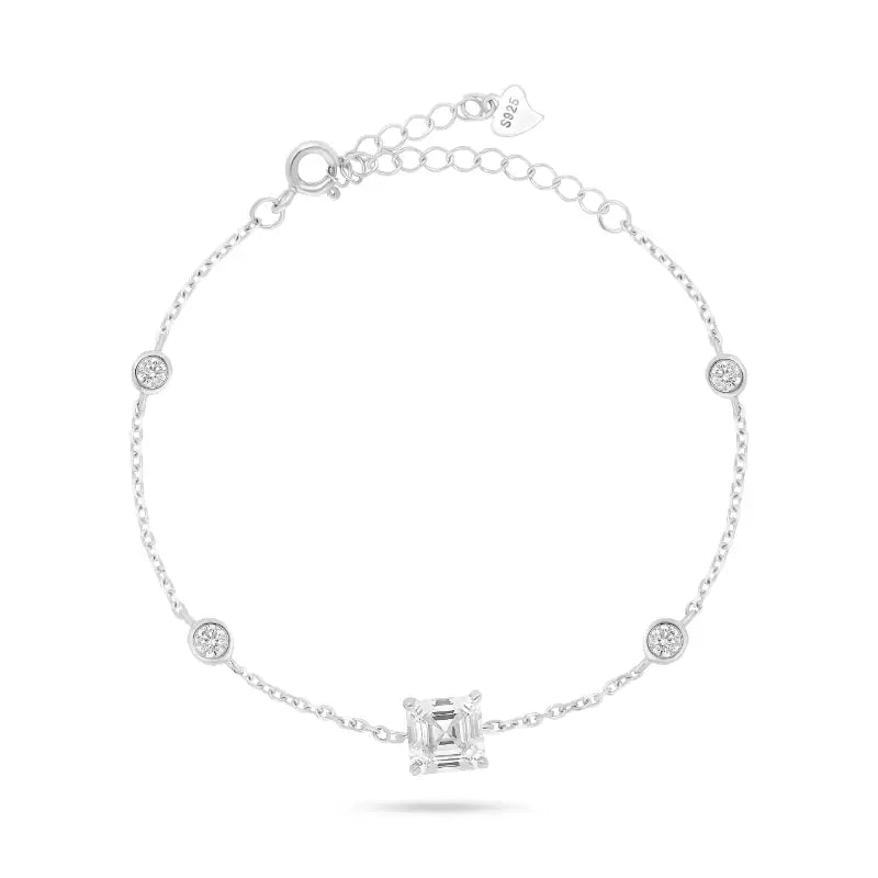צמיד כסף 925 עם אבן ריבועית מרכזית בחיתוך יהלום, מוקפת זרקונים קטנים. מתאים לערב ולאירועים מיוחדים.