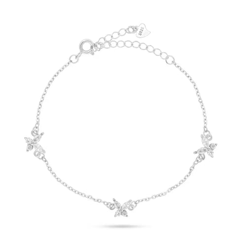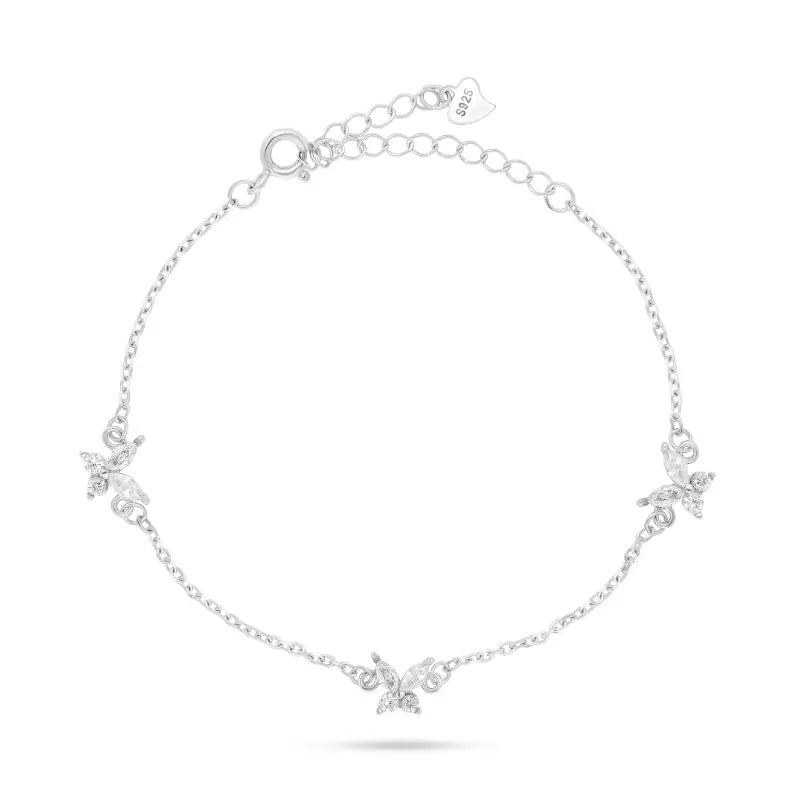 צמיד כסף 925 עם שלושה תליוני פרפרים משובצי זירקונים. מיועד לענידה יומיומית ולאירועים קיצים.
