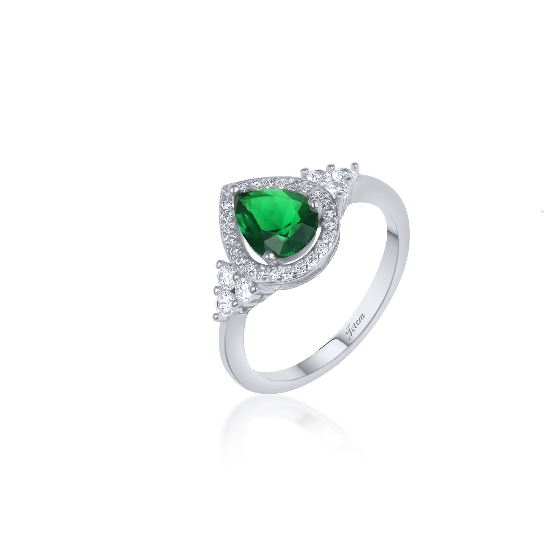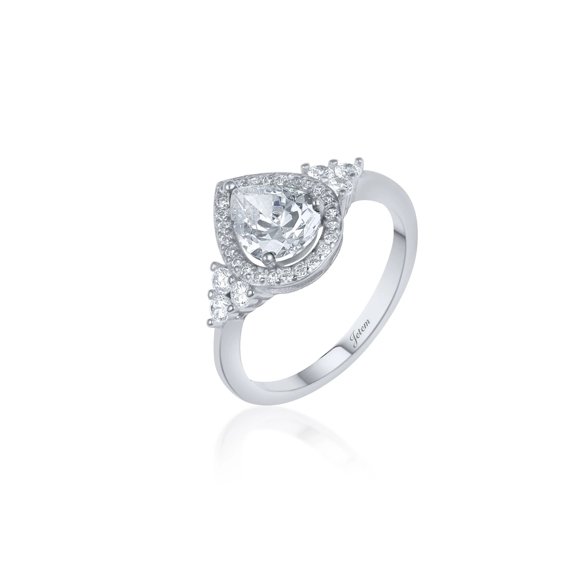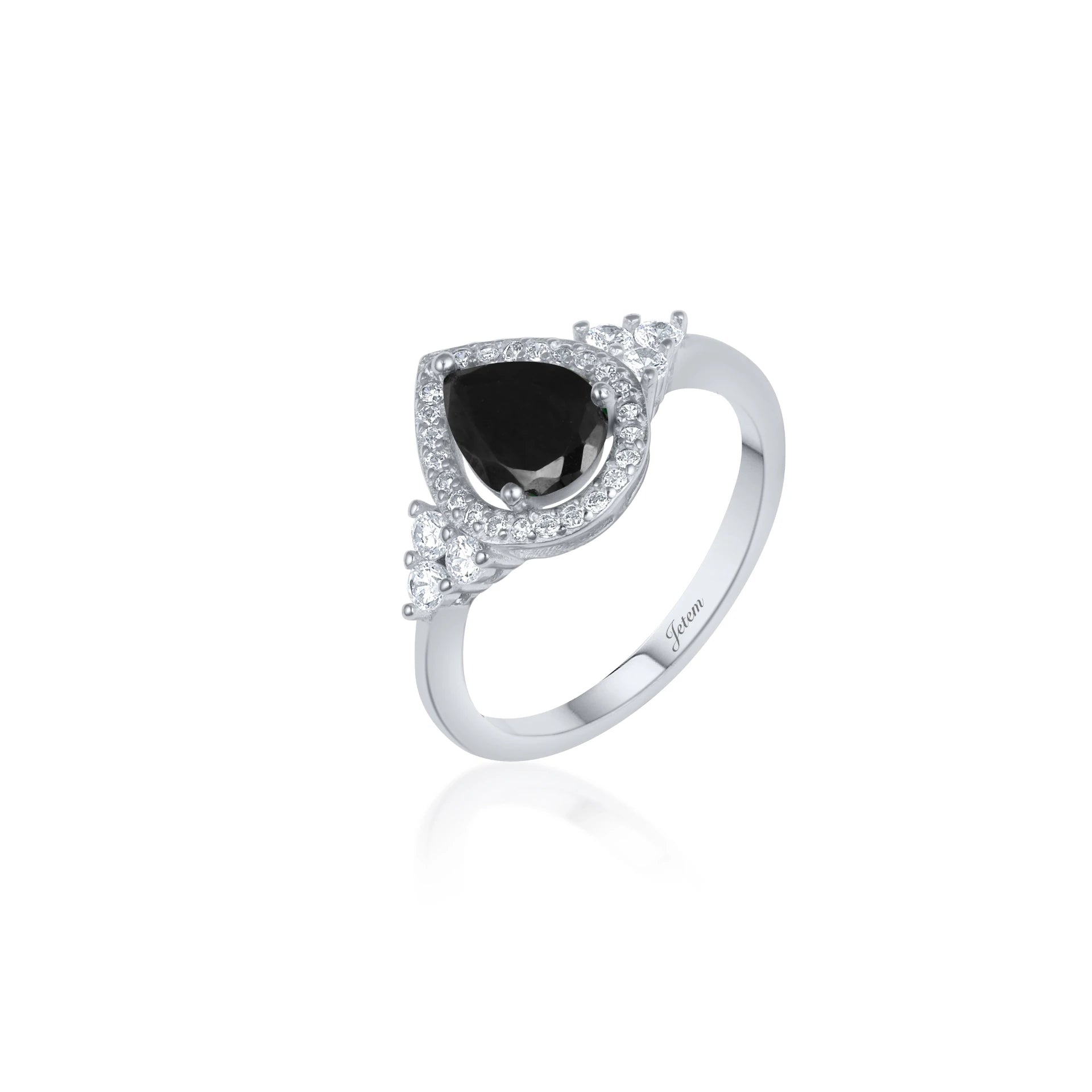 טבעת כסף 925 עם אבן סינתטית אדומה בצורת טיפה, משובצת בשורה של אבני זרקון קטנות סביב האבן המרכזית ובצדי החישוק. מתאימה לענידה יומיומית או לאירועים מיוחדים.